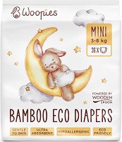 Еко пелените Woopies Mini са създадени от Wooden Spoon с мисъл за бебетата и природата. Те комбинират 100% биоразградими бамбукови нишки с естествени, дишащи и хипоалергенни материали, за да осигурят на вашето дете максимален комфорт и защита до 12 часа. Външният слой е направен от тъкан бамбук и гладък филм от царевично нишесте без ГМО, които осигуряват водоустойчивост и едновременно позволяват на кожата да диша. Вътрешният слой е изключително мек - комбинация от бамбукови влакна и специална мембрана, която задържа влагата навътре, за да запази бебешкото дупе сухо и щастливо. Пълнежът включва дървесна възобновяема ... |