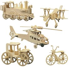 Комплектът от "Pebaro" ще се хареса на малки и пораснали любители на превозните средства. Той е изработен от дърво и съдържа 5 пъзела с различни елементи за сглобяване на различни видове превозни средства - велосипед, локомотив, самолет, автомобил и хеликоптер. След като сглобите моделите, ще можете да оцветите елементите им с боички и четка. Брой елементи на пъзелите: велосипед - 11 елемента локомотив - 30 елемента самолет - 18 елемента автомобил - 19 елемента хеликоптер - 24 елемента Съвет: За по-лесно нареждане не отделяйте всички части от таблата наведнъж. Започнете с тези, на които пише цифрата ...