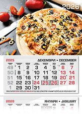 Характеристики на календара: 3 тела от 12 листа - на всеки лист по 1 месец (основен, предходен и предстоящ месец); фази на луната; имени дни; църковни празници; официални празници; съкращения на държавите, които честват свой празник на дадената дата; прозорче с ластици. ... |