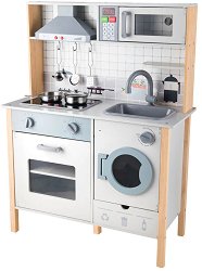 Чудесна дървена кухня от Iso Trade, която обещава незабравима и забавна игра за всяко дете. Тя разполага с всичко необходимо за въображаемите кулинарни приключения на малкия готвач – мивка, фурна, котлони с въртящи се бутони, които издават кликащ звук, и изключително реалистична микровълнова фурна. Просторният шкаф осигурява място за съхранение на всички кухненски аксесоари и допринася за усещането за реална кухня. В комплекта са включени тенджера, тиган и 4 дървени прибора за готвене, които допълват игровото изживяване. Играта с тази кухня развива фината моторика, въображението и ролевите умения на децата, като им ... |