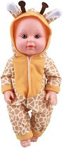 Представяме тази очарователна кукла, която ще бъде чудесен подарък за вашето момиченце. Тя е подходяща за деца над 18-месечна възраст и е изработена от пластмаса. Куклата пристига облечена в костюм на жираф. Към него са добавени и аксесоари като куфар, шише, виличка, лъжичка, чинийка, гърне, шише, памперс и биберон. Главата, ръцете и краката на куклата са подвижни, а за още по реалистична игра тя издава 6 бебешки звука. След като дадете вода на бебето, трябва да го сложите на гърнето, защото ще започне да пишка. Куклата е с височина 30.4 cm и работи с 3 батерии 1.5V AG13, които може да закупите отделно. ... |