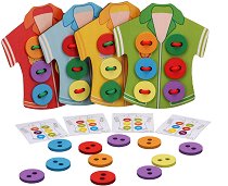 Образователният комплект е подходящ за деца над 3-годишна възраст. Той се състои от 4 фигурки на ризки, 36 цветни копчета, 4 цветни връзки и карти с предизвикателства. Ризките и копчетата са изработени от дърво, боядисано с безвредни бои на водна основа. Ризките разполагат с по 12 дупчици за нанизване на копчетата с помощта на връзките. Децата могат да нанижат цветните копчета на ризите по свой избор, или да се опитат да последват примера на някоя от картите. Това занимание има за цел да развива детското цветоусещане, координация и логическо мислене. За метода на Монтесори Революционен образователен метод - така ...