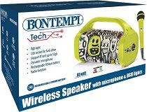 Безжичният високоговорител с микрофон от Bontempi съчетава модерен дизайн, практичност и забавление в едно компактно устройство. Моделът е оборудван с RGB светлини, които създават впечатляващи мигащи ефекти и допринасят за парти атмосферата у дома или навън. Високоговорителят позволява възпроизвеждане на музика от USB флаш памет, от micro SD карта, както и от смартфон, таблет, компютър или лаптоп чрез свързване с кабел. Устройството поддържа и безжична връзка (Bontempi 490230), което осигурява още по-голямо удобство при използване. Моделът разполага с радио функция и бутон за активиране на светлинните ефекти. ...