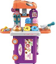 С комплекта ще може да имате своя собствена сладкарница. Тя се състои от нож, вилица, 2 фунийки със сладолед, 2 доната, пай, купичка, капак и други аксесоари. Комплектът идва във формата на куфарче, с дизайн на автобус, което разполага с удобна дръжка. По този начин, вашето мъниче ще може да носи любимата си играчка навсякъде. ... |