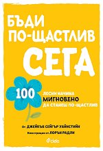 100 лесни начина мигновено да станеш по-щастлив. Бъди по-щастлив сега ще ви предложи 100 прости неща, които можете да направите още сега, за да предизвикате положителни промени в живота си. На този практически насочен наръчник не бива да се гледа като на списък със задължителни стъпки за изпълнение или като на строга програма за самопомощ - авторът предупреждава още в началото колко погрешен е този подход. Това не е списък, а по-скоро бюфет, пълен с вкусни почерпки за душата и тялото ви - лесни и прости за приготвяне, с които можете да се награждавате всеки ден, без да изпитвате вина, че не сте ги направили всичките. ... |