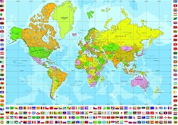 Картата съдържа информация за: географска мрежа; държави, представени чрез фоново оцветяване и държавни граници; знамена на държавите; столици; основни градове; хидрография; легенда. Стенната карта е с пластмасови лайсни по дългата страна. Размера на разпънатата карта е 140 x 100 cm. ... |