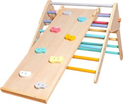 Пиклер триъгълникът от GINGER HOME – дървена катерушка и пързалка в едно – е идеалният избор за активни деца, които искат да развиват своите двигателни умения. Вдъхновен от метода на Монтесори и принципите на д-р Ема Пиклер, този многофункционален уред предлага безопасно, забавно и стимулиращо пространство за игра и развитие у дома. Комбинираната конструкция включва двустранна дъска – гладка пързалка от едната страна и стена за катерене с цветни захвати от другата. Чрез катерене и пързаляне децата укрепват мускулите си, развиват баланс и координация, а регулируемият наклон на дъската позволява адаптиране към различни ... |