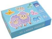 Комплектът от "Andreu Toys" на тема "Животни и техните малки". Той съдържа 6 пъзела с растяща сложност от 3, 4, 5, 6, 7 и 8 елемента. Всеки от тях изобразява животно и неговото малко. Размерите на наредените пъзели са между 15 и 23 cm. ... |