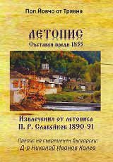 Извлечения от летописа: П. Р. Славейков 1890 - 1891. Препис на съвременен български: Д-р Николай Иванов Колев. ... "В ръцете си държиш извлечения от летописа на поп Йовчо от Трявна, който е починал на 23 март 1855 г. Да четем извадки от този изключителен документ дължим на П. Р. Славейков, който за първи път ги публикува в "Извлечения из летописа на поп Йовчо от Трявна" в "Сборник за народни умотворения, наука и книжнина", издаден от Министерството на народното просвещение, София, Държавна печатница, Книга II, 1890, стр. 310; Книга III, 1890, стр. 381, Книга IV, 1891, стр. 601." Д-р ... |