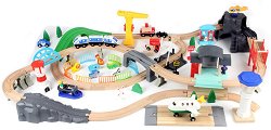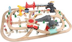 Малчуганите ще се впуснат в скоростни приключения с влакчето с релси. Комплектът включва дървени релси, мост, надлези, бариери, локомотив, вагони с магнитно закрепване, хеликоптер, камиончета, колички, дървета, храсти, пътни знаци, светофар, фигурки на животни и хора, придържащи елементи, сгради, магнитен кран и кръстовище. Децата могат да спазват правилата за движение като се научат да разпознават пътните знаци. Влакчето може да премине през гара, хеликоптерна площадка, мост и строителен кран. Комплектът е подходящ за разиграване на ролеви игри. Дайте шанс на децата да развият своето въображение, логическо мислене, фина ...