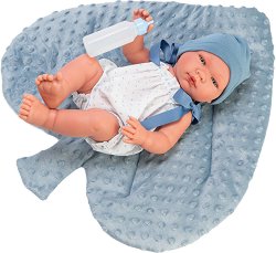 Куклата бебе Пабло от Asi е създадена за игра, грижа и прегръдки и стимулира въображението и чувството за отговорност у децата. Изработена е от висококачествен винил, мек и приятен на допир, и може да се къпе - идеална за деца, които обичат да се грижат за своето бебе, дори във ваната. Подвижните ръце и крака позволяват свободно позициониране, а половите белези и липсата на коса допълват усещането за реализъм - досущ като при истинско новородено. Лицето на Пабло е с изразителни светли очи и дълги мигли, които придават мек и жив поглед. Облечен е в късо бяло гащеризонче със сини панделки, а на главата носи нежна синя ... |
