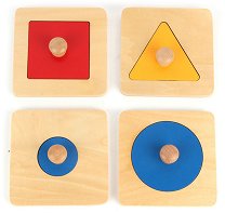 Детският комплект ще се хареса на малчуганите. Той е подходящ за деца над 2-годишна възраст и има за цел да развива детското пространствено усещане. Комплектът се състои от 4 подложки с изрязани отвори и 4 геометрични форми за сортиране с пинчета за по-лесно захващане. Геометричните форми са малък и голям кръг, квадрат и триъгълник. Елементите са изработени от дърво, боядисано с безвредни бои на водна основа и са подходящи за активна игра. Всяка от подложките за редене са с размери 12 x 12 cm. За метода на Монтесори Революционен образователен метод - така би звучало най-краткото обяснения на подхода " ...