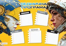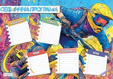 Седмичната програма включва дните от понеделник до петък, отделение за учебната смяна и началото и края на учебните часове. Към учебната програма са добавени и самозалепващи стикери с изучаваните през срока предмети. Така децата ще се забавляват докато подготвят текущата си програма, като по този начин ще бъде и прегледна. Ученическата програма се предлага в два различни формата: формат A4 (с размери 29.7 x 21 cm) и формат А3 (30 х 42 cm). ...