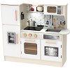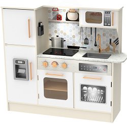 Голяма и модерна дървена кухня за игра - кухнята на "Classic World" има точно тези плюсове. Създадена е с внушителни за играчка размери - дължината ѝ е около 95 cm, а в най-високата си част достига приблизително 90 cm. Освен това, дизайнът ѝ е изключително модерен, така че кухнята на детето може да бъде отлично допълнение към съвременния интериор на дома. Що се отнася до "уредите" в детската кухня, ще видите всичко необходимо и типично за модерните кухни днес. Има мини "керамични" котлони и мини микровълнова с отваряема вратичка, на която с картинка са пресъздадени копчета и ... | |||||||