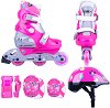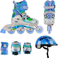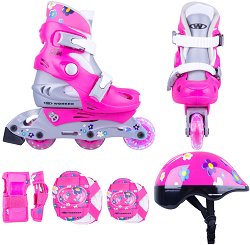 Близки съвпадения: обувка Точно съвпадение: Колела Близки съвпадения: колелцата Детските ролери "Polly" от "Worker" са в комплект с протектори за китки, лакти и колена, и каска. Така лесно ще екипирате детето с всичко необходимо за безопасно каране. А за да е по-забавно, колелцата са с вградени LED светлини, които светят при въртене. Размерът на ролерите се регулира с помощта на ръчка, като един комплект обхваща 3 номера. Шасито е изработено от пластмаса, а закопчаването е от 2 щраймера. Каската е олекотена с отвори за проветряване, а протекторите се закопчават с помощта на велкро ленти, вътрешната им страна е от мек текстил и са подсилени с твърда пластмаса. Характеристики на ... | |||||||