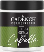 Релефната паста Capella от CADENCE е водоразтворима, акрилна, фина текстурирана паста с полуматов релеф. Използва се върху платно, стени и твърди повърхности за създаване на 3D ефекти. Може да се нанася с помощта на шпатула, мистрия, шаблон, арт текстура и техники на свободен стил. Може да се оцвети с акрилна боя, без да се променя консистенцията или да се боядиса след изсъхване. Изсъхва в рамките на 24 часа в зависимост от дебелината и метеорологичните условия. Поради твърдата си текстура, когато е суха, не е подходяща за шлайфане. Произведен е по евронорми (стандарти CE и EN71) и е безопасна за употреба. ...