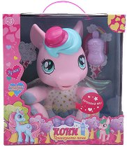 Сладкото приказно пони на име Кони ще грабне вниманието на вашето дете. Тялото на играчката е изработено от мека материя, а крилете му от лъскав текстил. Щом детето натисне дясното краче на понито, то ще започне да пее песнички, а при натискане на лявото краче ще започне да разказва приказни. Когато детето натисне коремчето на играчката, тя ще издаде забавни звуци. Към комплекта са включени и няколко аксесоара за Кони - шише с мляко и сладка шапчица, която свети. Детската играчка работи с 3 броя батерии 1.5V AAA, които са включени в комплекта с демонстративна цел. Препоръчва се те да бъдат подменени с нови, преди детето ... |
