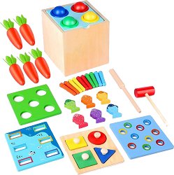 Дървената кутия с активни занимания включва 5 сменяеми капака, всеки от които предлага различна игра - риболов, игра с чукче, събиране на моркови, хващане на червейчета и подреждане на геометрични фигури. Към комплекта са включени магнитна пръчица, чукче, фигурки на морковчета, фигурки на рибки, фигурки на червейчета, топчета и геометрични форми. Всички компоненти могат да се съхраняват в кутията. Играчката е подходяща за деца над 1 година. Комплектът е изработен от висококачествено дърво и е оцветен в безвредни бои на водна основа. Всички ръбове са фино полирани и заоблени за по-голяма безопасност при игра. Той е ... |