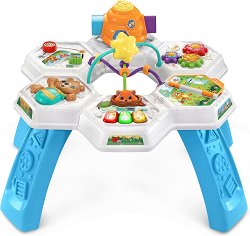 Активната масичка от Vtech предлага разнообразни възможности за игра както в седнало, така и в изправено положение, благодарение на подвижните си крака, които осигуряват удобство и лесно съхранение. Масичката е изпълнена с интересни елементи – светещи клавиши на пиано, лисица, която се показва, мини книжка с истории, въртяща се мечка, лабиринт с животни, цветни зъбни колела и сортер за форми във вид на кошер. Тези занимателни активности подпомагат развитието на двигателните умения, сензорното възприятие и ранното езиково развитие, като същевременно запознават децата с цветове, животни, числа и нови думи. Масичката ... |